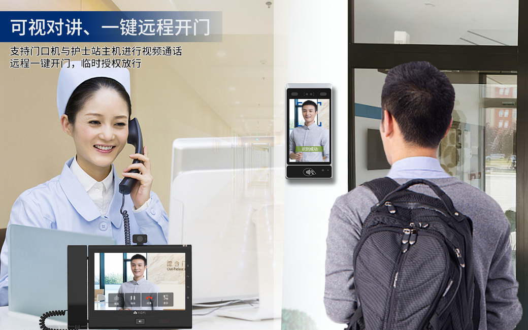 天波醫(yī)院人臉識別門禁可視對講解決方案,支持門口機(jī)與護(hù)士站主機(jī)進(jìn)行視頻通話,護(hù)士通過護(hù)士站主機(jī)確認(rèn)訪客身份,遠(yuǎn)程一鍵開門,臨時授權(quán)放行。
