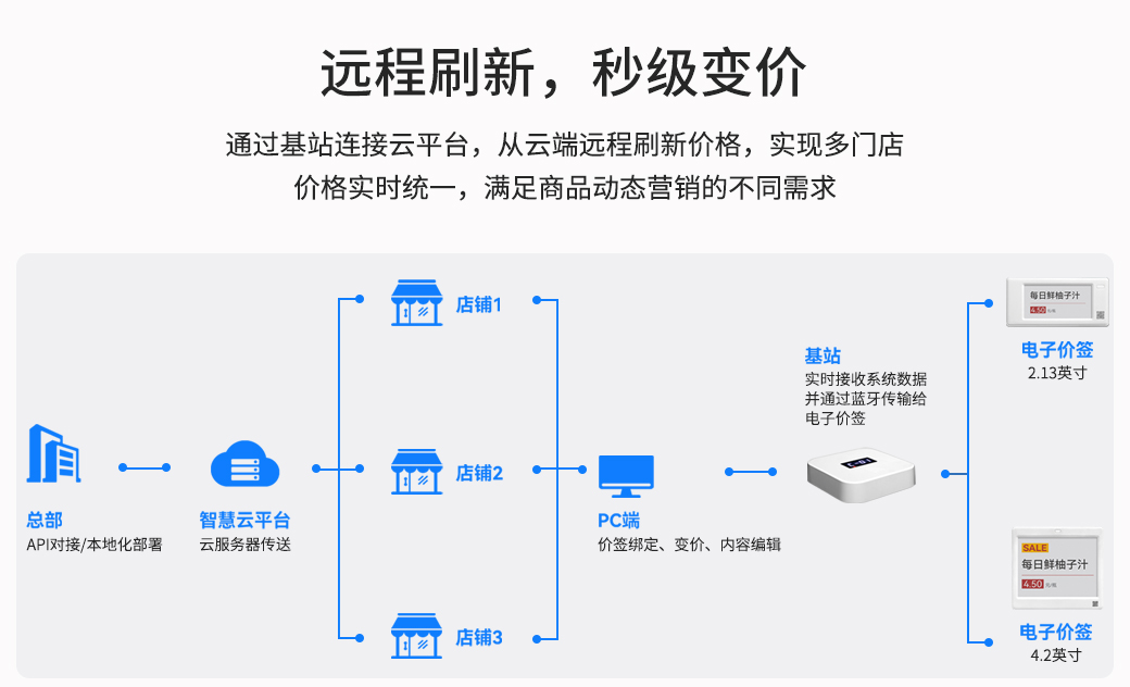 天波超市電子價簽通過基站連接云平臺,可以從云端遠程刷新價格。每個電子標簽都有唯一ID號,在標簽和基站之間提供藍牙 5.2無線連接,并經(jīng)過加密處理,在保證速度的同時確保數(shù)據(jù)安全。例如一家遍布多個省巿的連鎖超市,只需在總部后臺更改價格,就能同時實現(xiàn)多門店價格調(diào)整,滿足超市動態(tài)營銷需求。